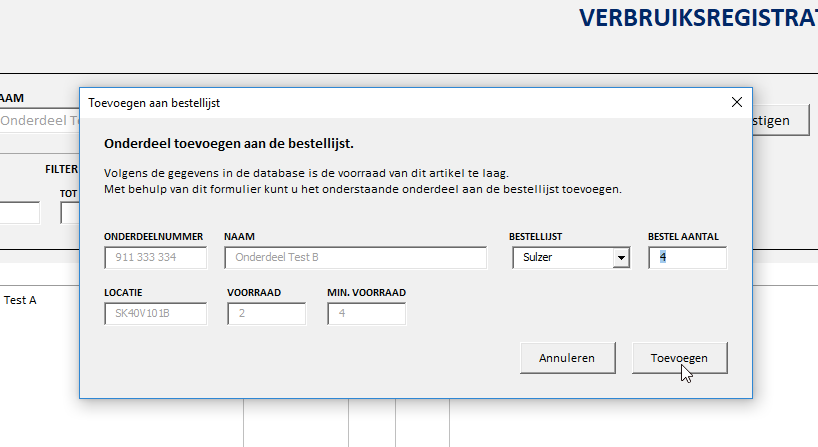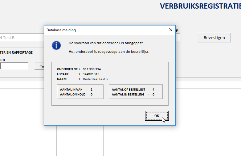 Klik op om deze melding te sluiten. Het onderdeel dat zojuist is geboekt, staat nu in de verbruikslijst.